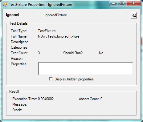 The test properties dialog is displayed using either the View | Properties menu item on the main menu or the Properties item on the context menu. It shows information about the test and – if it has been run – about the results. The dialog contains a “pin” button in the upper right corner, which causes it to remain open as the user clicks on different tests.